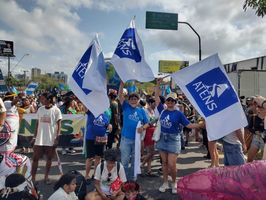Nelson Moraes da Silva Rosa, diretor de Assuntos de Aposentadoria da ATENS UFRGS Seção Sindical, integrou a frente formada por membros do sindicato nacional que se uniram à Marcha Mundial pelo Clima. O expressivo evento somou a participação de 70 mil pessoas ocupando as ruas de Belém (PA) no sábado (15/11). Também estavam no ato Wilza da Silveira Pinto, diretora de Articulação Nacional do ATENS SN, e Alessandra Fortunato de Almeida, secretária-geral da seção sindical da ATENS UFRA (foto).