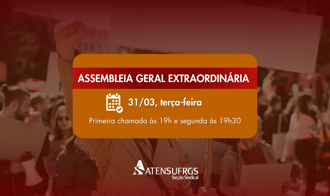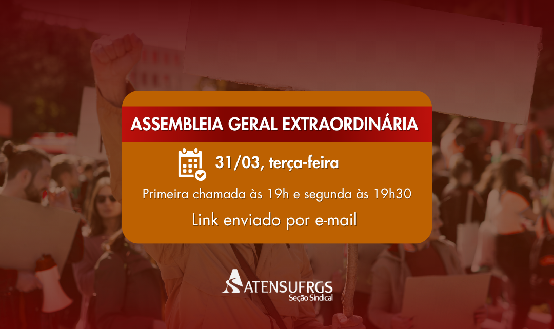 Nesta terça-feira (31/03) é o dia da nossa Assembleia Geral Extraordinária. A reunião ocorre de forma virtual, com primeira chamada às 19h e segunda às 19h30. O encontro tem como objetivo a atualização e mobilização sobre o estado de greve local e a situação da greve nacional dos TAEs. Também serão pontos da pauta informes […]