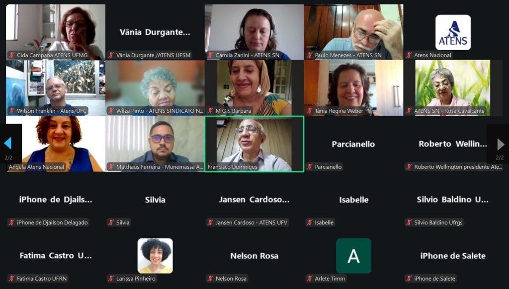 Ocorreu nesta quarta-feira (17/12), o VI Fórum Nacional do ATENS SN, que reuniu de forma virtual mais de 30 dirigentes de todo o Brasil, incluindo a Diretoria Nacional, representantes das Seções Sindicais e coordenações locais. Participaram do evento, representando a ATENS UFRGS, a presidente, Camila Mokwa Zanini, a vice-presidente, Clarissa Martins de Lucena Santafé Aguiar, o secretário geral, Silvio Baldino Junior, e o diretor de Assuntos de Aposentadoria. Nelson Moraes da Silva Rosa.